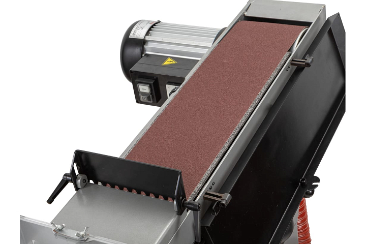 При шлифовании на этом станке возможно образование больших объемов пыли и стружки. Для их эффективного отведения предусмотрен встроенный пыле-стружкоотсос, также предусмотрено подключение внешнего удаления пыли. Для обеспечения безопасности оператора на JBSM-150B применяется несколько технических решений. Так, наиболее вероятная травматичная зона над ведомым роликом закрыта специальным прозрачным экраном. Кроме того, в комплекте поставки имеется крышка верхней части шлифовальной лены, - для тех случаев, когда не требуется обработка крупноразмерных деталей. Рядом с рабочей зоной предусмотрена кнопка аварийного отключения электродвигателя. Станок установлен на жесткую станину с широким основанием и крепится к полу с помощью болтов. Такой подход обеспечивает устойчивость и сводит к минимуму возможность появления вибраций в зоне шлифовки. JBSM-150B сразу же готов к работе после установки.