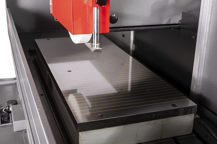 Стол приводится в движение вручную или через гидравлический привод (в правом или левом направлении), скорость плавно изменяется с помощью регулировочного рычага, расположенного на салазках. В поперечном направлении движение стола осуществляется вручную или двигателем через ходовой винт. Шлифовальная голова перемещается с автоматической подачей в диапазоне от 5 до 50мкм с помощью приводного серводвигателя Delta и PLC контроллера фирмы Siemens.