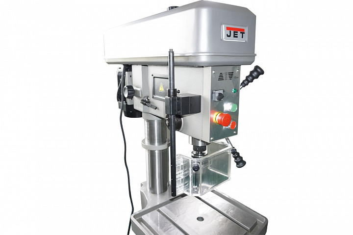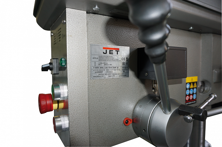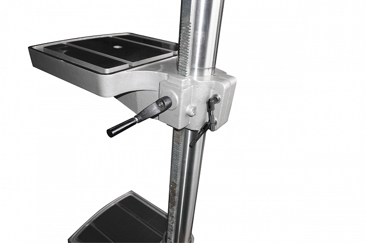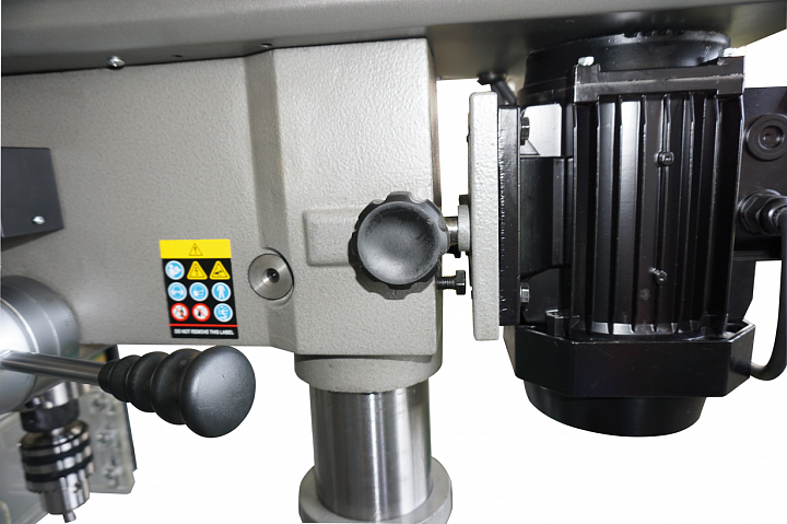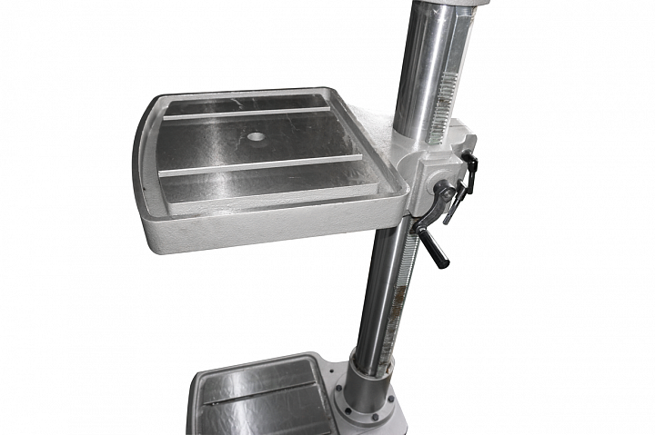 Индустриальный вертикальный сверлильный станок по металлу способный нарезать резьбу в стали, в режиме постоянных нагрузок, до М14. Станок оснащен мощным асинхронным двигателем в 750 Вт и подключается к сети 380 В. Станок предназначен и для сверления как заготовок небольшого размера, которые размещаются на столе, отлитый из серого чугуна, так и заготовок высоких, которые можно закрепить на основании, как же изготовленном из серого чугуна. Максимальное расстояние от шпинделя до основания составляет 1 метр 10 см (1100 мм). На основании предусмотрены два т-образных паза, которые надежно закрепят заготовку или оснастку.