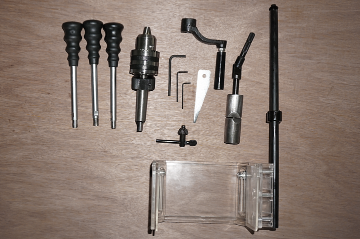 Стол имеет возможность поворота и перемещается благодаря рейке по толстостенной колоне диаметром 70 мм, а также имеет возможность поворота по оси колоны. Конус шпинделя МК-3, что позволяет использовать большое разнообразие сверл с хвостовиками. Кстати станок способен сверлить отверстия в стали до 32 мм. /основная функция станка — это нарезание резьбы. Выставляем нужную глубину захода метчика и станок по достижению оной автоматически меняет направление вращения шпинделя. Все легко и просто. Максимальный ход 134 мм. Минимальные обороты 200 оборотом в минуту. Момент прекрасно сохраняется за счет ременной передачи, а если необходимо использовать термосверла можно развить обороты до 2250 оборотов в мин. Вес станка в сборе составляет 200 кг. Станок поставляется с патроном от 3 до 16 мм и дорном с МК-3 на В16.