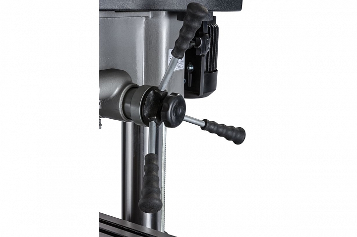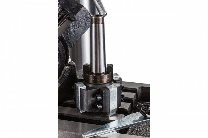 Сверлильно-фрезерный станок выполняет широкий спектр операций. Максимально допустимый диаметр сверления составляет 30 мм. При выполнении фрезерных работ допускается работа концевыми фрезами с максимальным диаметром 20мм и фрезами для торцевого фрезерования с максимальным диаметром 75мм. Модель оснащена шпинделем с конусом МК3, зажимная тяга которого составляет М12. Для повышения жесткости фиксации опора шпинделя оборудована группой конических подшипников. Ход пиноли составляет 125мм. Для повышения качества обработки и повышения производительности работ, на станке установлена функция микроподачи шпинделя. Технологический процесс контролируется механической регулировкой вылета шпинделя.